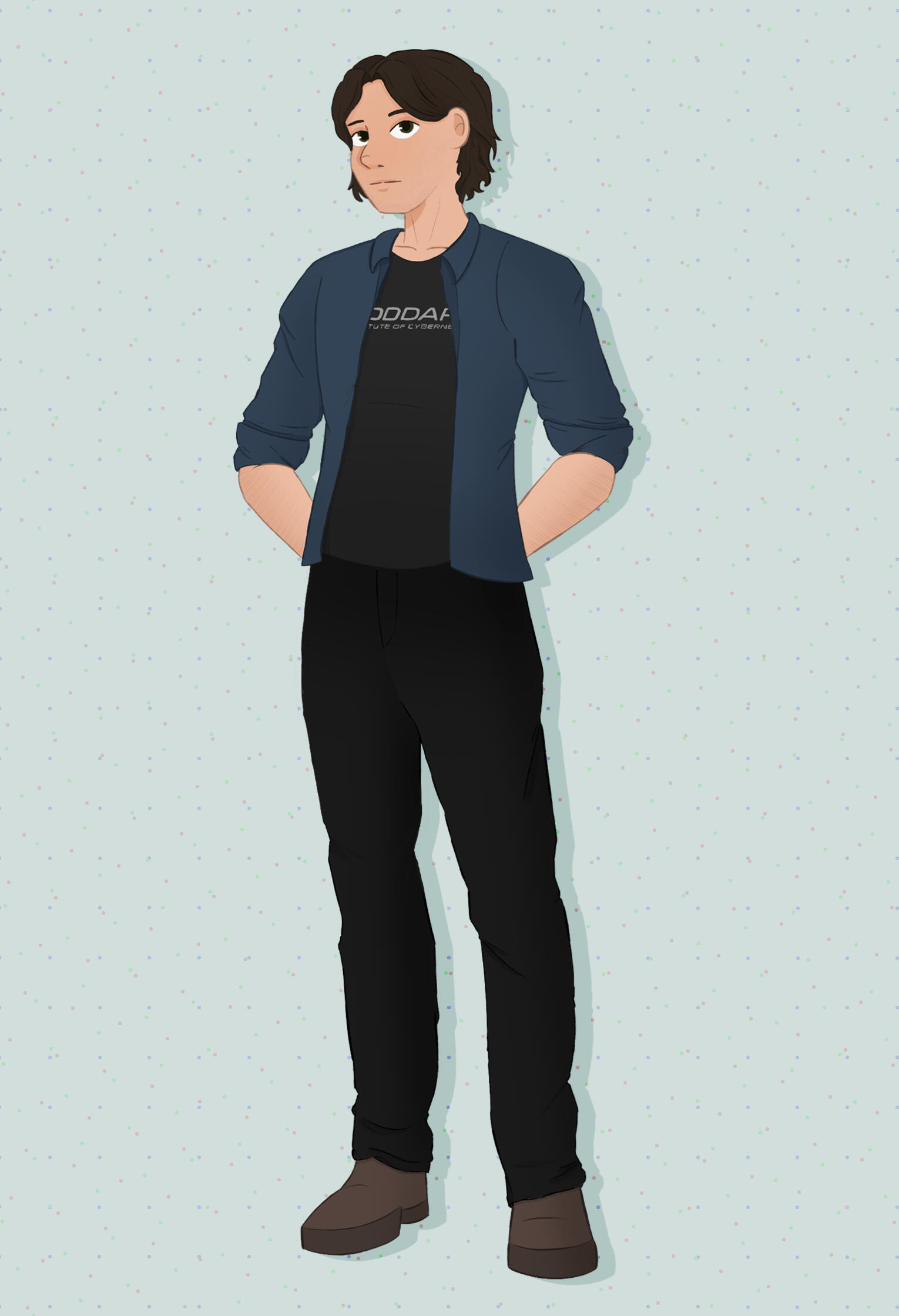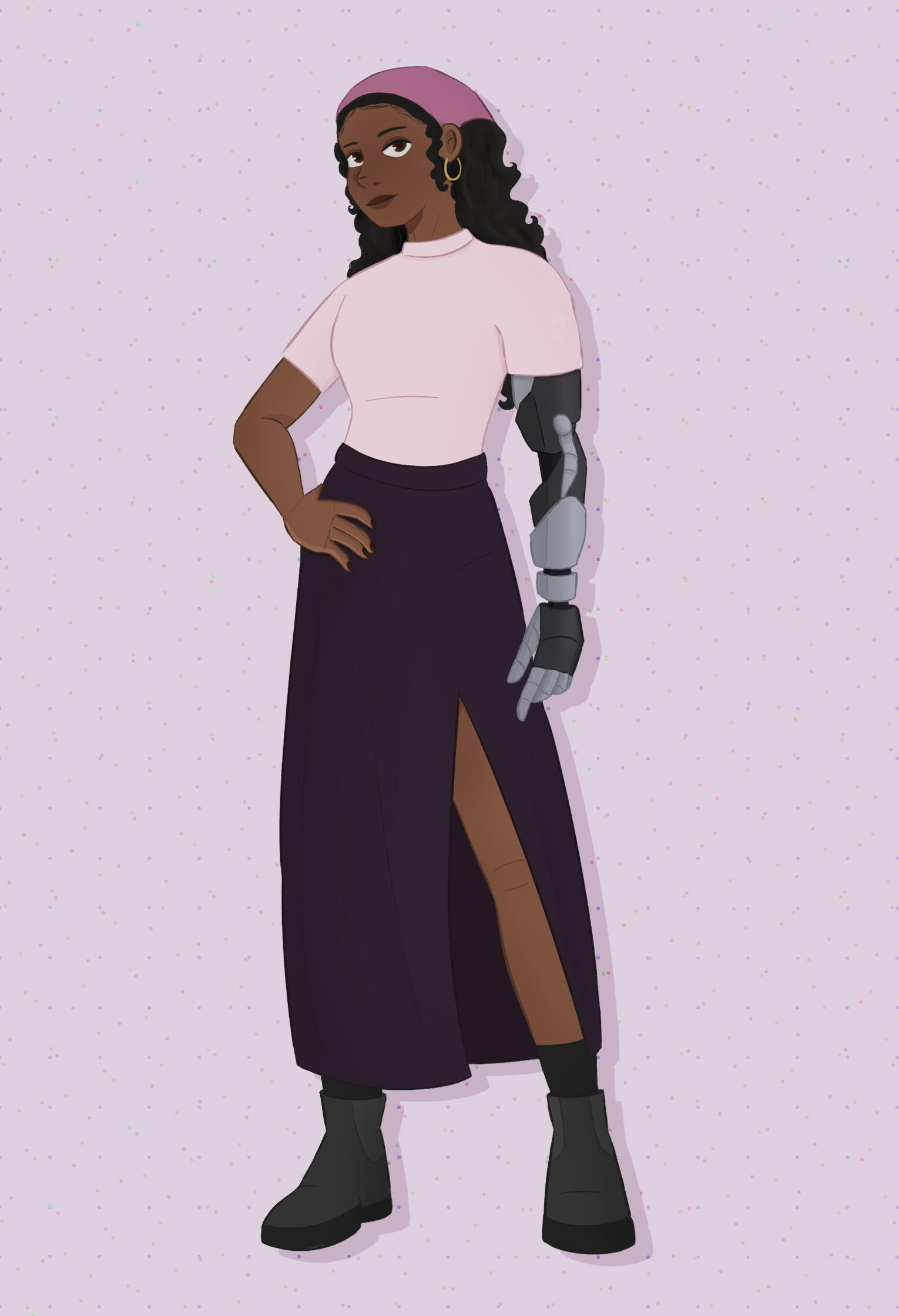 Even though she's years newer than the main cast, I have fallen in love with Nora. She was inspired by a Charlie character named Emma- a medical test subject from the 80s who lives nearly frozen in time. Charlie and I created these OCs months/years before we met, but found a lot of overlap. I asked the question, "if we have the technology in the 2020s to upload a human brain to a robot body, who was the first ever patient that kickstarted this technology?" Having a character like Nora who pulls strings from the shadows and is always one step ahead is so compelling and also a little bit haunting. Whereas Adya's cyborg identity is proper and Caelius's is edgy, Nora's is a bit old and grotesque. She's not state of the art; she's a cobbled-together mess of experiments and secrets.